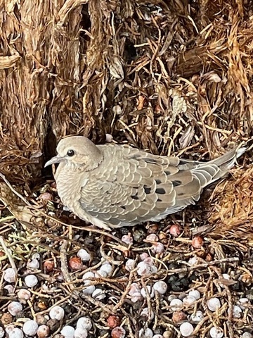 I was using a garden hose to water the juniper tree in my front yard when all of sudden something hopped up and disappeared. I walked around the tree and found a baby mourning dove huddled next to the base of the juniper. Its coloring was so much like the tree that it was hard to spot.