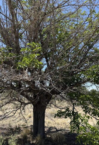 Recently, I was driving on Mickey Drive in Farmington, NM, and spotted a mulberry tree that looked healthy in spots and almost dead in others. It captured my attention, so I took a picture of it.
