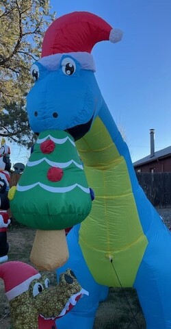 One of their Christmas displays includes a blue dinosaur with a red Christmas hat. It picks up and sets down a Christmas tree many times throughout the day. When I take walks through the neighborhood, I always slow down as I walk by their yard so I can enjoy their colorful decorations.